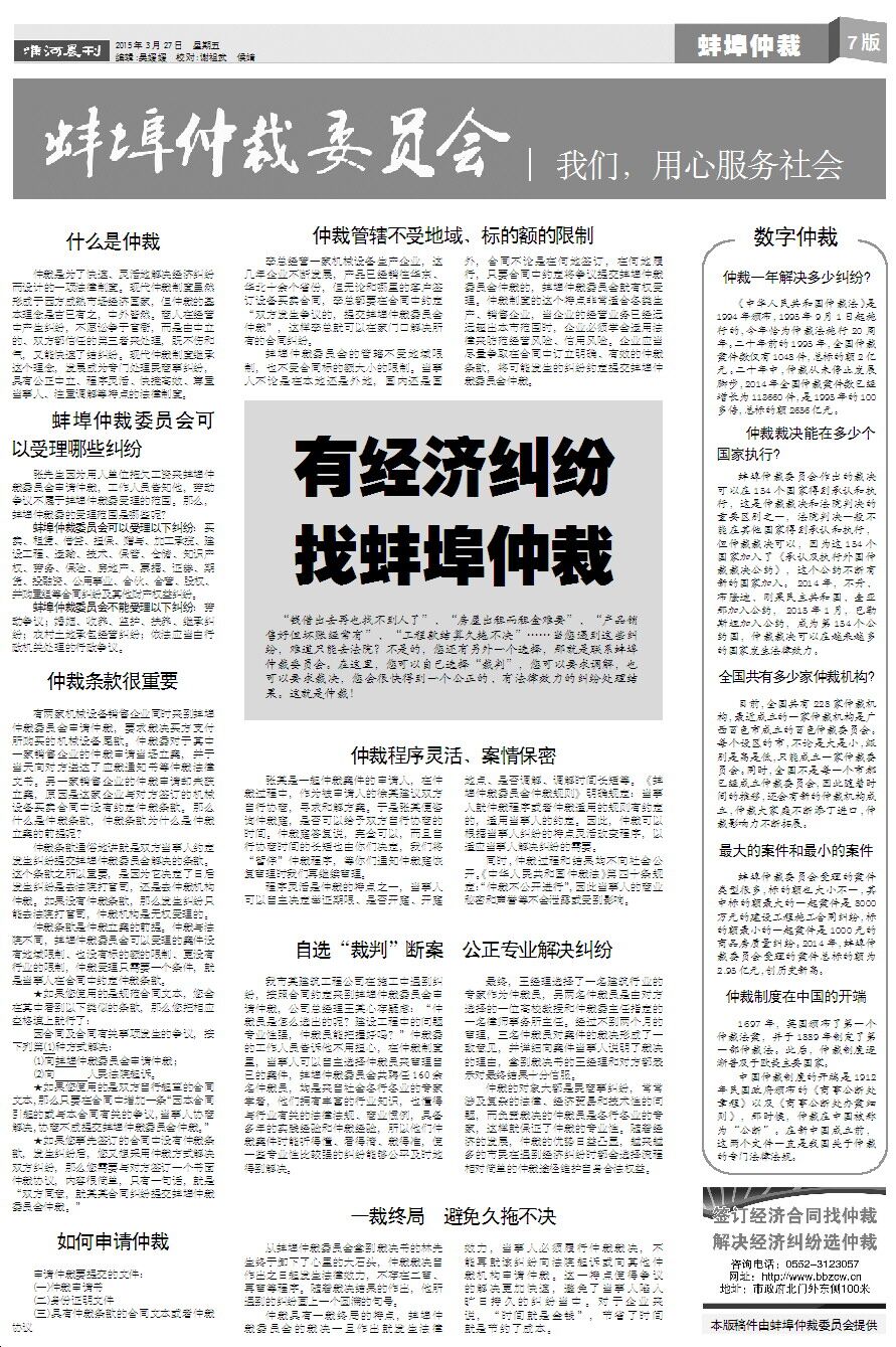 “钱借出去再也找不到人了”、“房屋出租而租金难要”、“产品销售好但坏账经常有”、“工程款结算久拖不决”……当您遇到这些纠纷,难道只能去法院?不是的,您还有另外一个选择,那就是联系蚌埠仲裁委员会。在这里,您可以自己选择“裁判”,您可以要求调解,也可以要求裁决,您会很快得到一个公正的、有法律效力的纠纷处理结果。这就是仲裁!